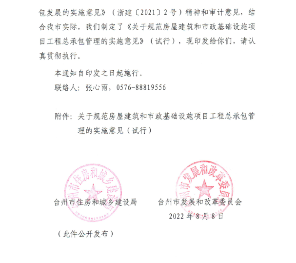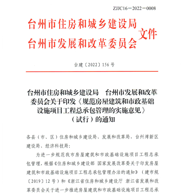 臺州市住房和城鄉(xiāng)建設(shè)局、臺州市發(fā)展和改革委員會關(guān)于印發(fā)《規(guī)范房屋建筑和市政基礎(chǔ)設(shè)施項目工程總承包管理的實施意見》(施行)的通知
